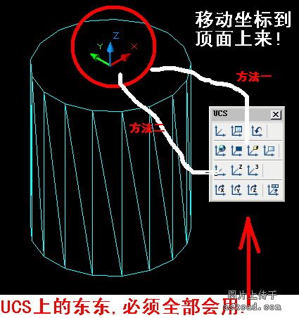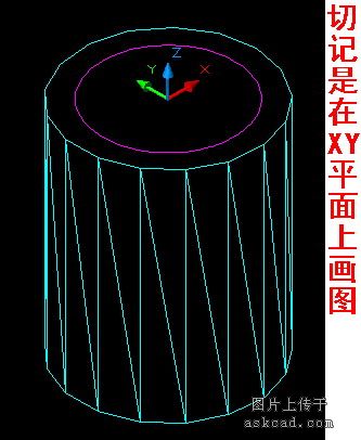 小議:這是最容易想到的辦法,任何初學的朋友都會想到這一點,但是不要認為簡單就不留意哦,相當多的朋友用這種方法畫出來的杯子是開口向下的,而底面向上的。這是初學最容易不注意的地方之一,為什么會這樣呢,看過上集的朋友想想就明白了,因為auto cad有個極其重要的東西,很多人不注意,結果畫了幾個月還不斷出錯就來源于此,auto cad畫圖是默認在"x-y"平面進行的(切記!切記!),在三維中同樣是這樣的,所以畫圖時眼睛一定要時常留意"坐標軸圖示"的變化(切記!切記!!!),auto cad畫圖在空間是默認以"z"軸正方向為上的(切記!)。