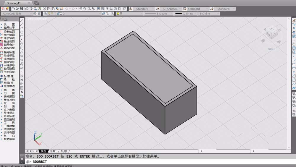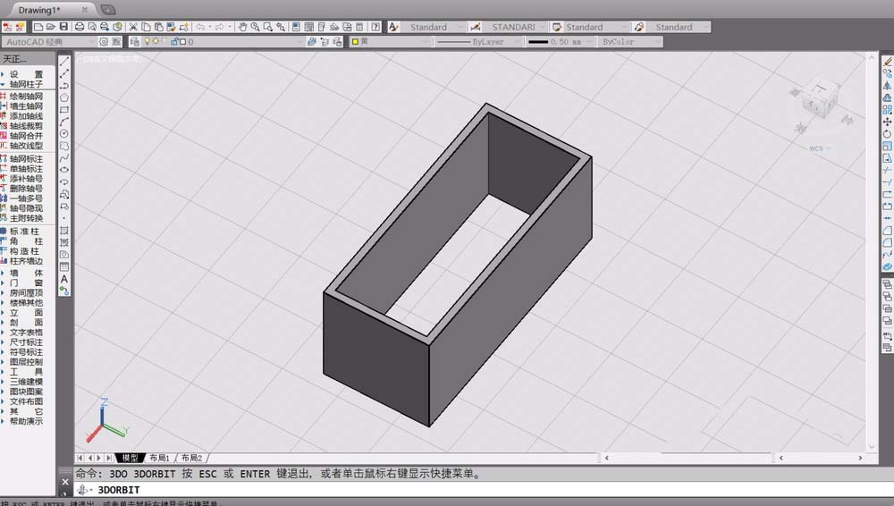 1、首先我們開啟AutoCad,進入到三維模型的建模頁面,簡單的利用拉伸命令,就會獲得完全的體塊,不能夠體現空間。