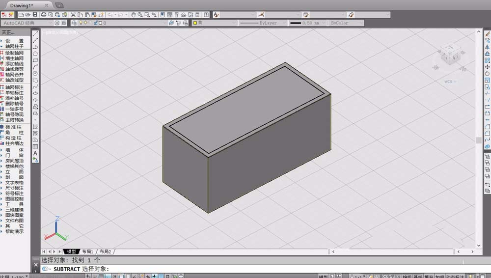 5、完成命令操作后,我們就可以看到,當前的體塊頂部被去除,處于空心的狀態,這樣我們就完成了模型空間的建立。
