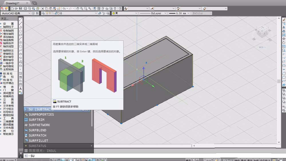 2、我們直接輸入命令SU,按下空格鍵,進入到差集合并命令,利用此命令我們可以刪除或者保留部分重疊的體塊。