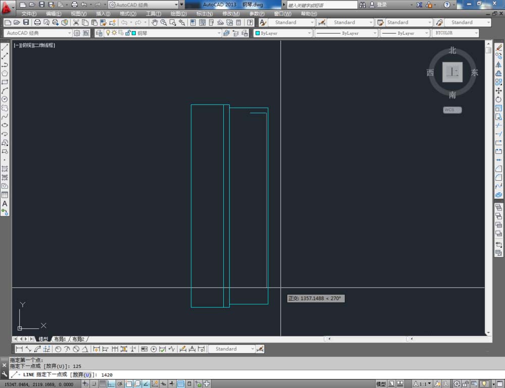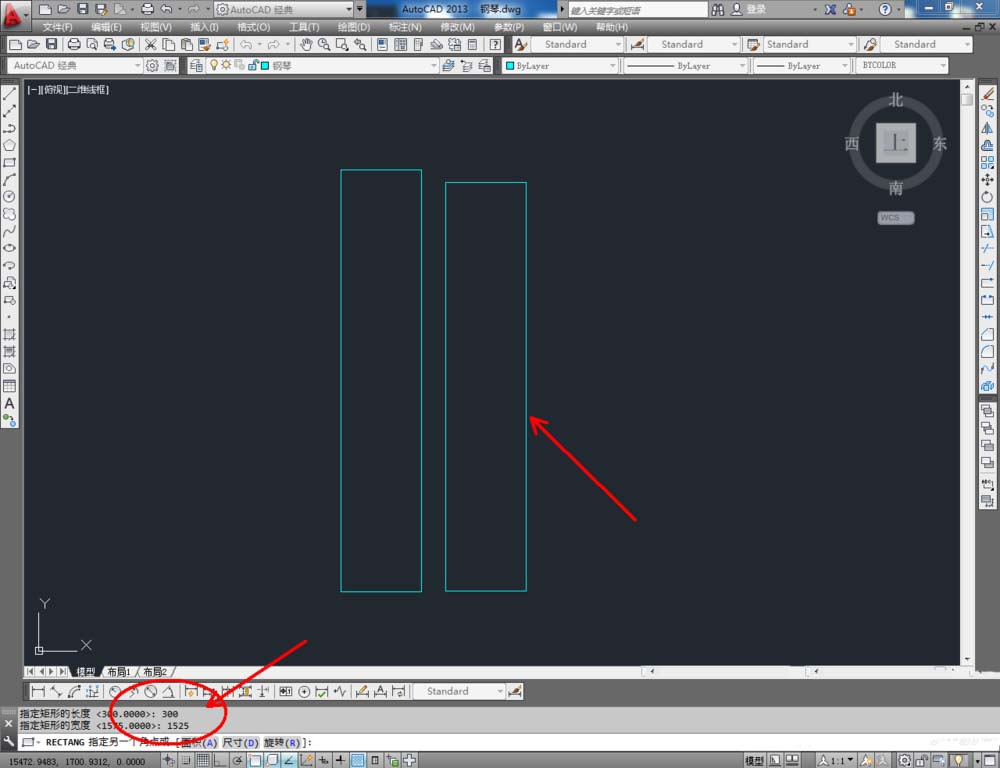 2、點擊【矩形工具】,按圖示在命令欄輸入:300和1575兩個數值,繪制出一個300*1575mm的矩形圖案。在命令欄輸入:300和1525兩個數值,繪制出一個300*1525mm的矩形圖案,并調整好兩個圖案之間的位置。點擊【直線工具】在鋼琴蓋部位繪制一條線段(如圖所示);