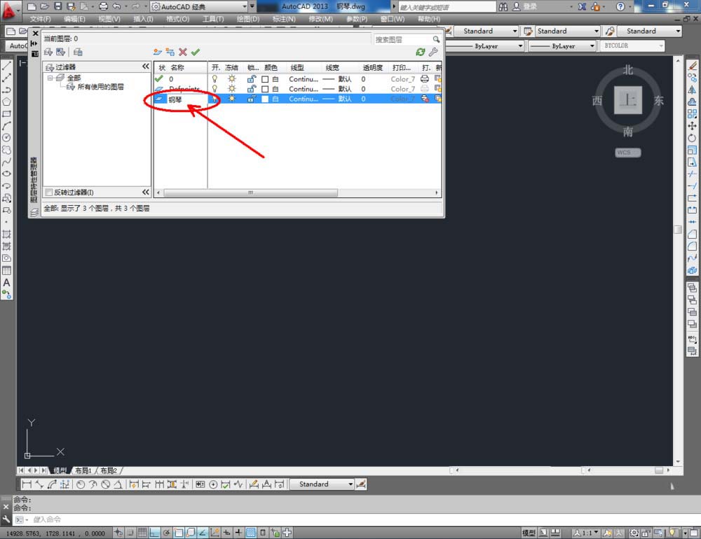 1、打開AutoCAD 2013軟件,點擊【圖層特性管理器】,點擊【新建圖層】,將圖層命名為:鋼琴。點擊色塊,按圖示設置一個圖層顏色,完成鋼琴圖層的設置(如圖所示);