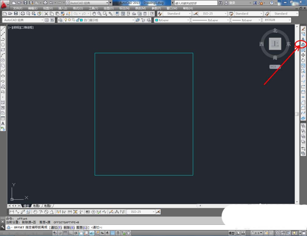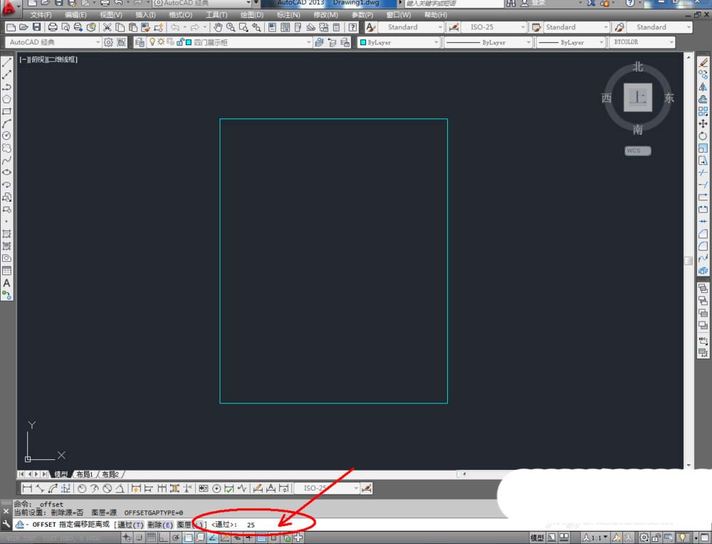 3、點擊右邊工具欄中的【偏移】,在命令欄中輸入: 25,選中圖案側邊和頂邊,依次對側邊和頂邊進行向內偏移。在命令欄中輸入:80,選中底邊,將底邊進行向上偏移(如圖所示);