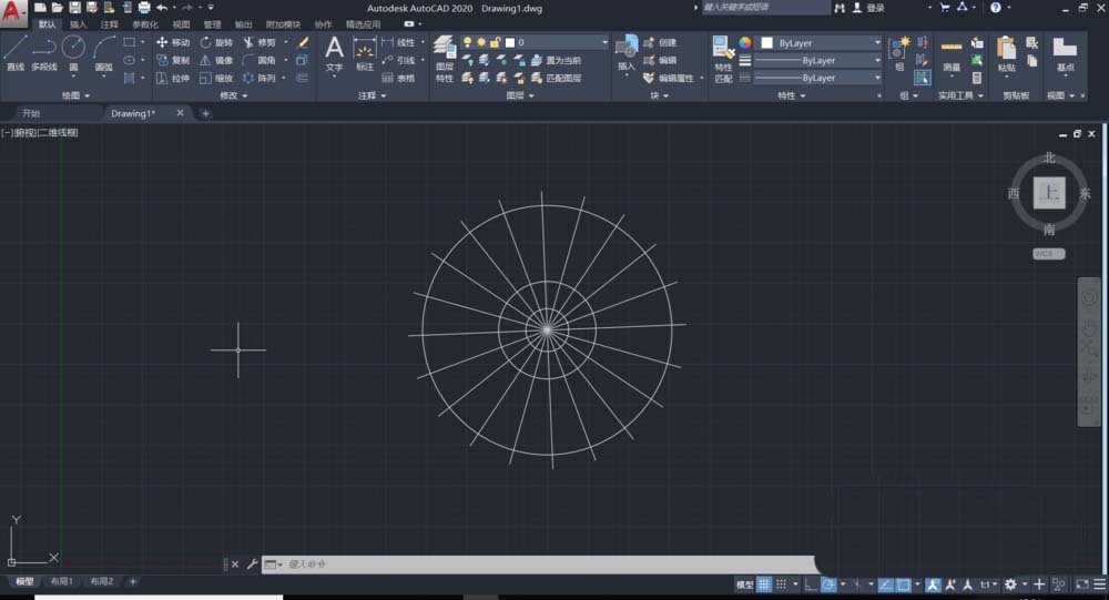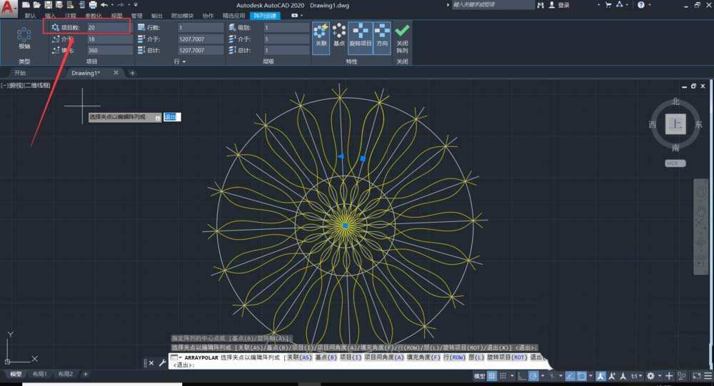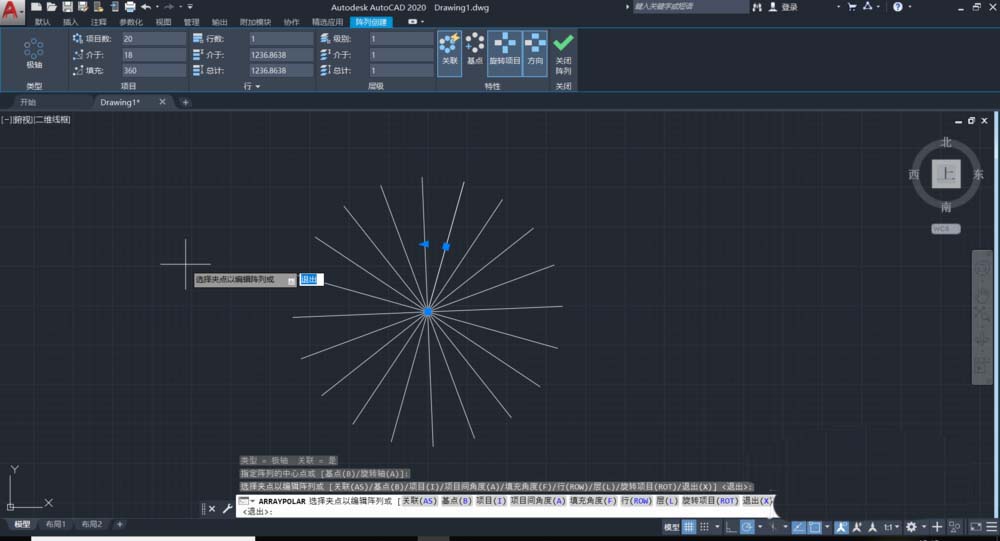 2、選擇直線,以直線一端為陣列中心,進行環形陣列,陣列項目書設置為20.