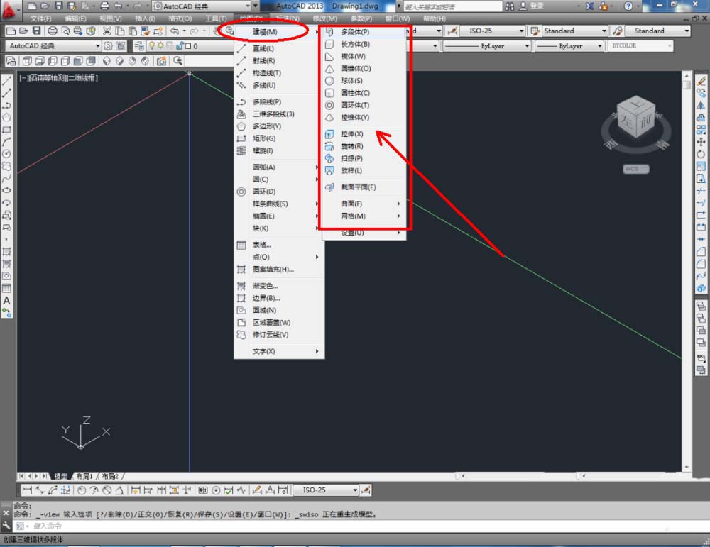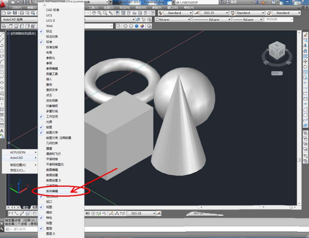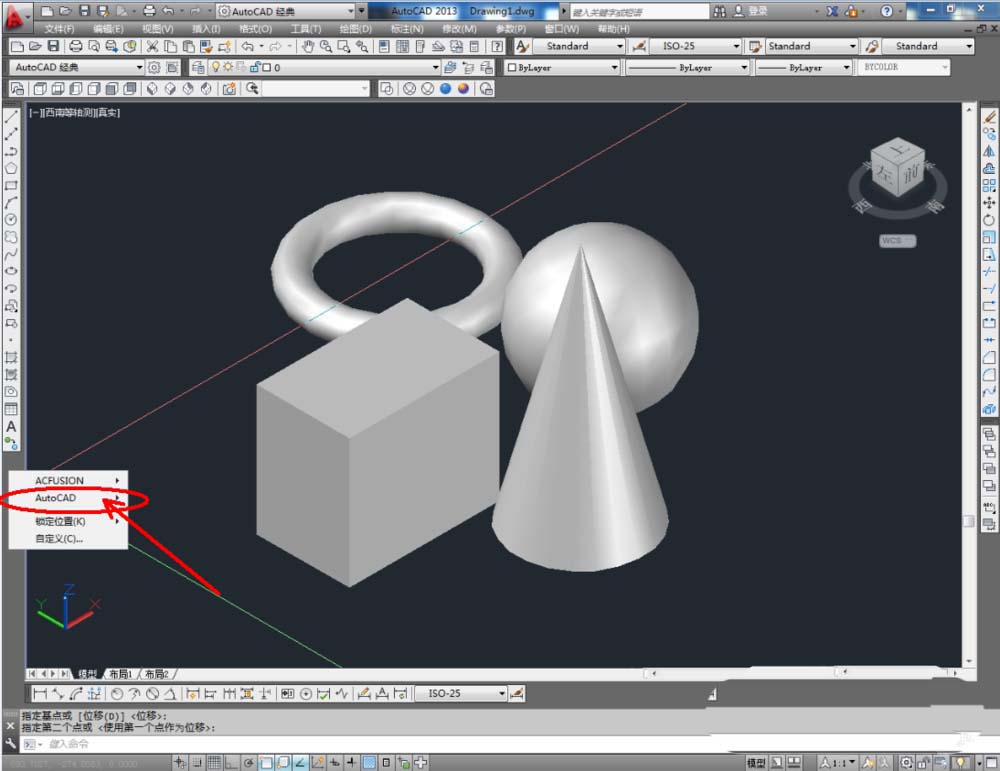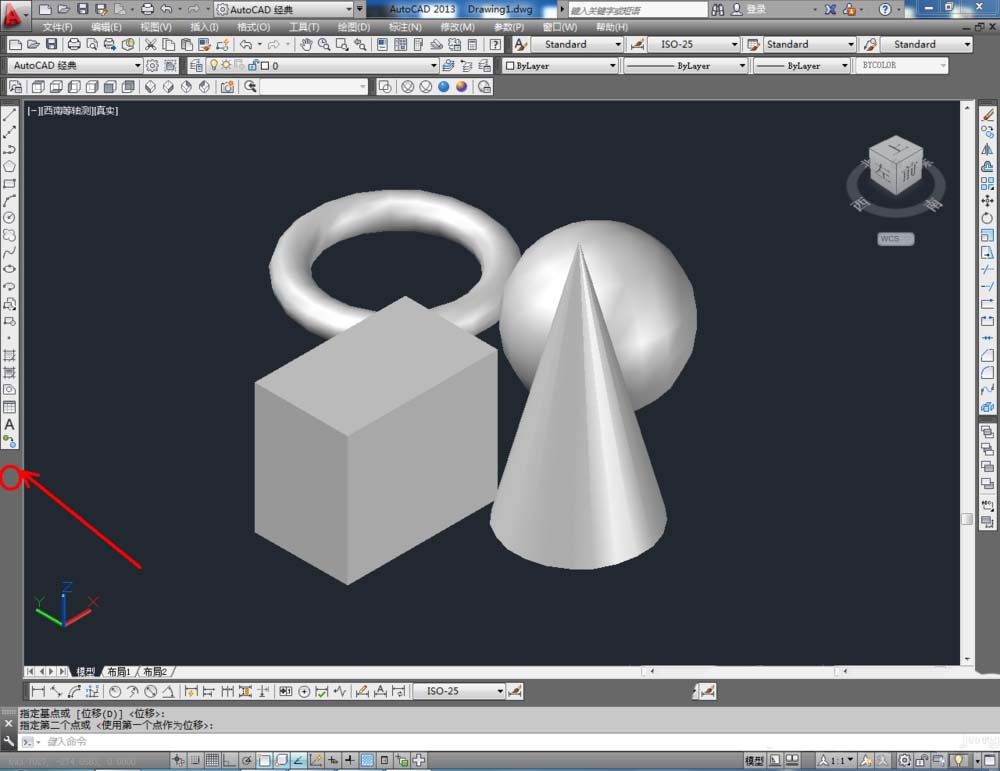 2、點擊【西南等軸測】,將作圖界面切換為西南視圖界面。點擊【繪圖】-【建模】,點擊【長方體】、【圓錐體】、【圓環(huán)】、【球體】依次制作出幾個模型基本體(如圖所示);