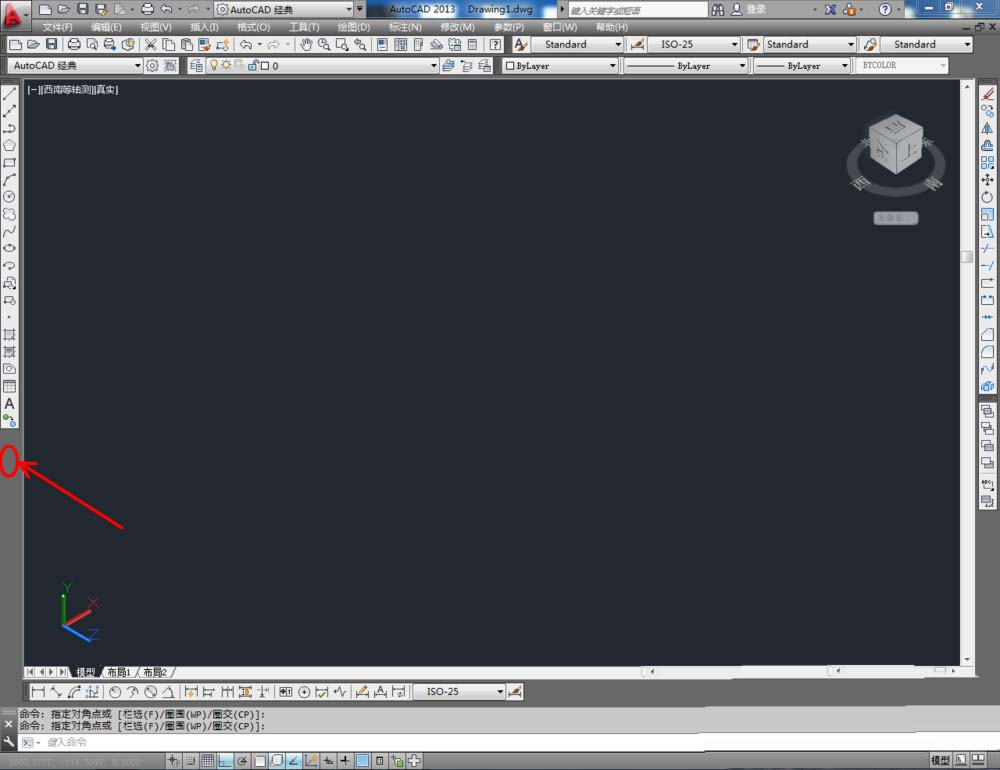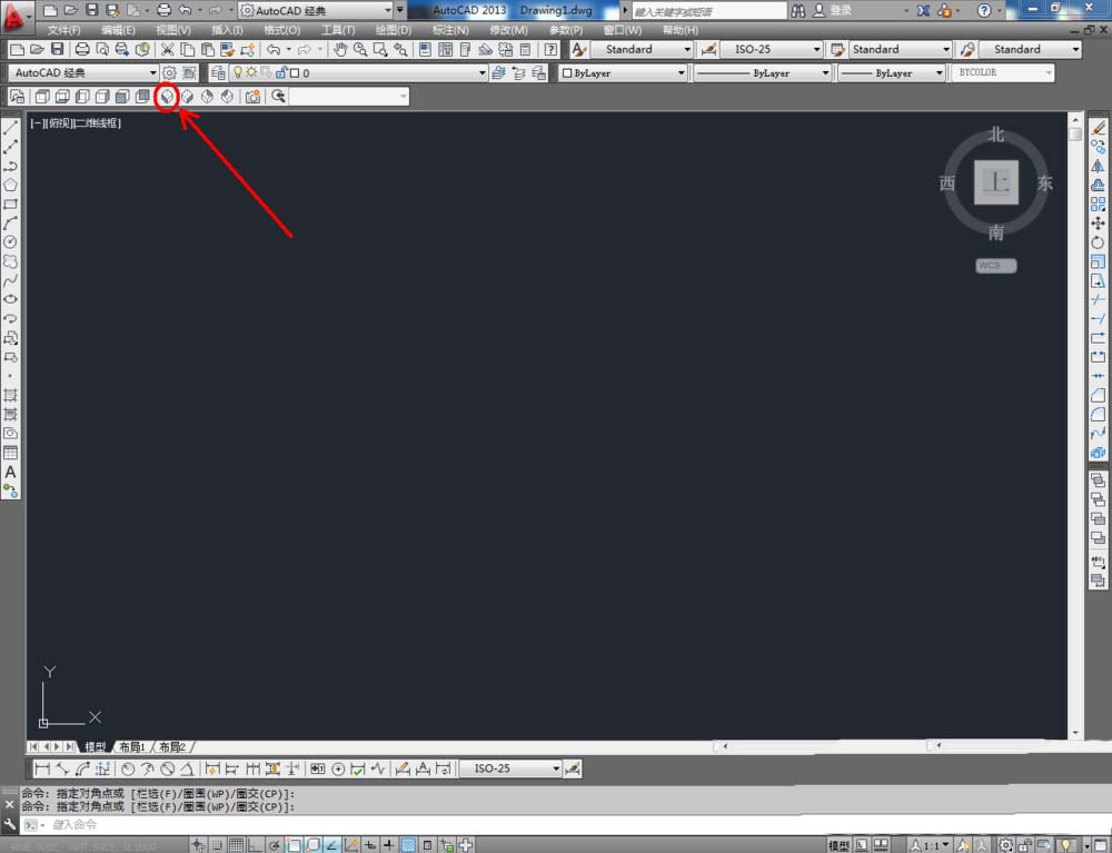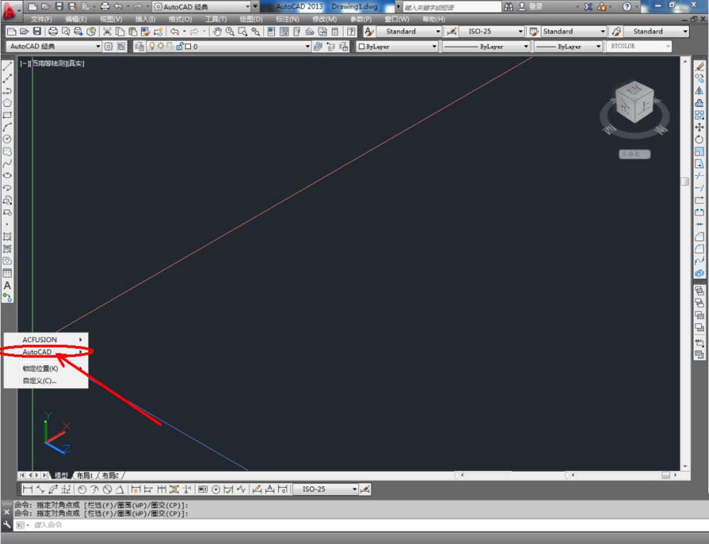 1、打開AutoCAD 2013軟件,鼠標(biāo)移動到圖示區(qū)域,點擊鼠標(biāo)右鍵-【AutoCAD】,勾選【視圖】,將視圖工具調(diào)出到作圖界面并按圖示調(diào)整好工具欄的位置;