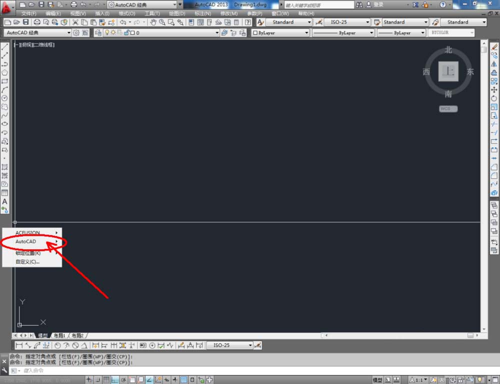 1、打開AutoCAD 2013軟件,鼠標移動到圖示區域,點擊鼠標右鍵-【AutoCAD】,勾選【建模】、【視圖】和【視覺樣式】,將這三個工具欄調出并按圖示調整好工具欄的位置;