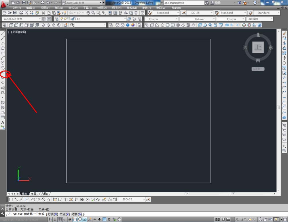 3、點擊視圖工具欄中的【俯視】將視圖切換到俯視圖界面,點擊【樣條曲線】按圖示在作圖區域繪制一個自定義圖案。點擊【面域】,拾取圖案并點擊空格鍵確認,完成圖案的面域操作(如圖所示);