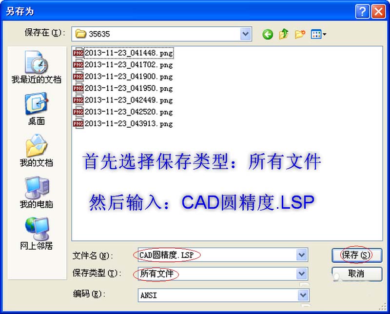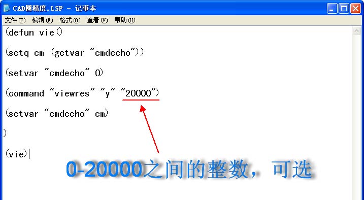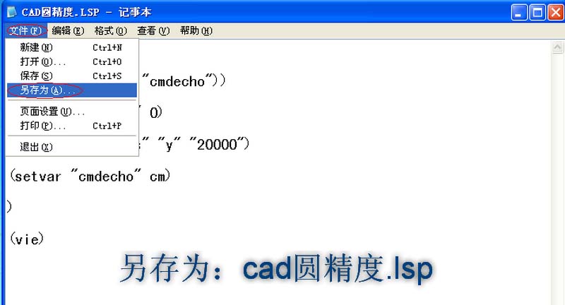 首先,我們來建立一個擴展名為LSP的文檔,文件名為cad圓精度。文件名可隨意。把步驟2復制到記事本上,選擇另存