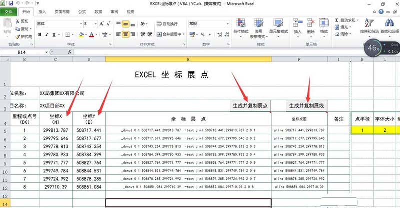 2、將對應(yīng)的x、y軸復(fù)制到表格中,點(diǎn)擊生成并復(fù)制展點(diǎn),設(shè)置點(diǎn)的大小和半徑,點(diǎn)擊生成并復(fù)制展線。(表格計算程序可自行在網(wǎng)上下載)