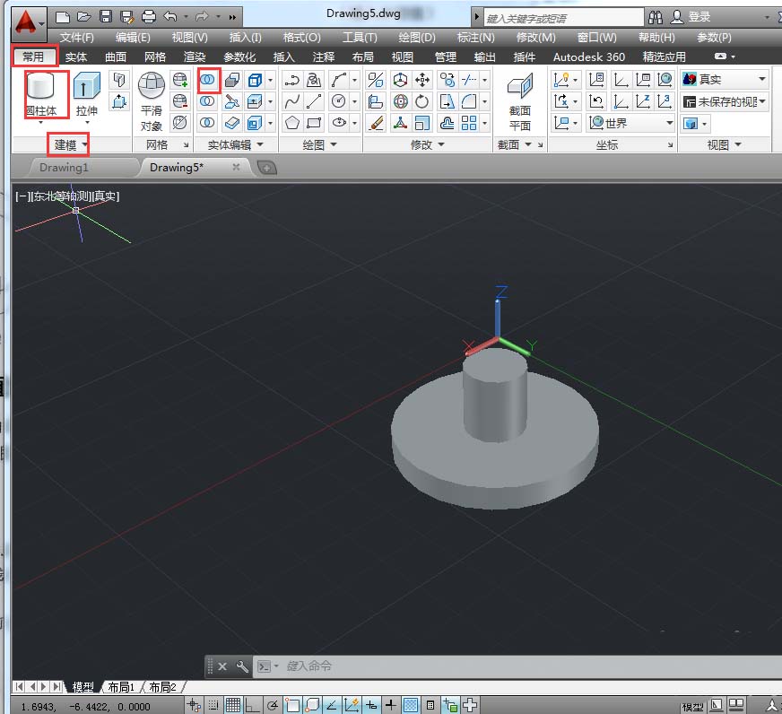 1、首先通過【常用】》【建模】》【圓柱體】繪制兩個圓柱,并通過【交集】操作合并兩個圓柱。