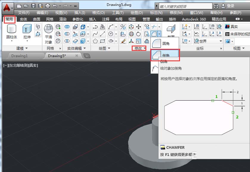 2、接著在菜單欄依次找到【常用】》【修改】》【倒角】選項。