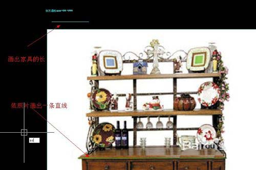 2、預先得知原家具的長寬高,然后依照照片中的長度方向畫直線,下一步,用縮放工具縮到相對一致的大小。縮放命令的操作:SC--R--P,即可得到圖中效果。
