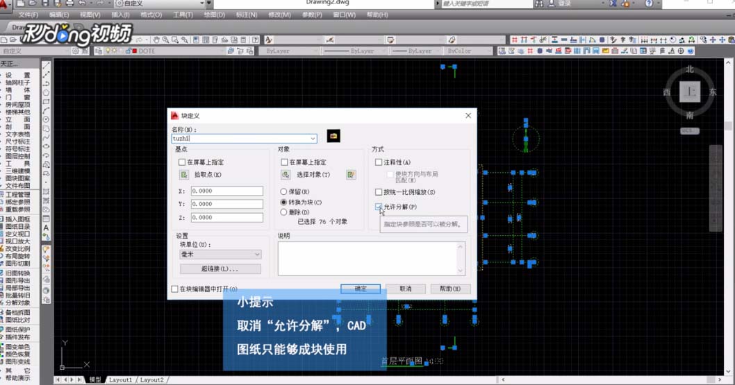 3、在彈出的對話框中,輸入“塊”的名稱,在右側,在窗口右側的方式設置欄中,取消勾選“允許分解”,點擊確定,即可將圖紙成塊,無法正常編輯