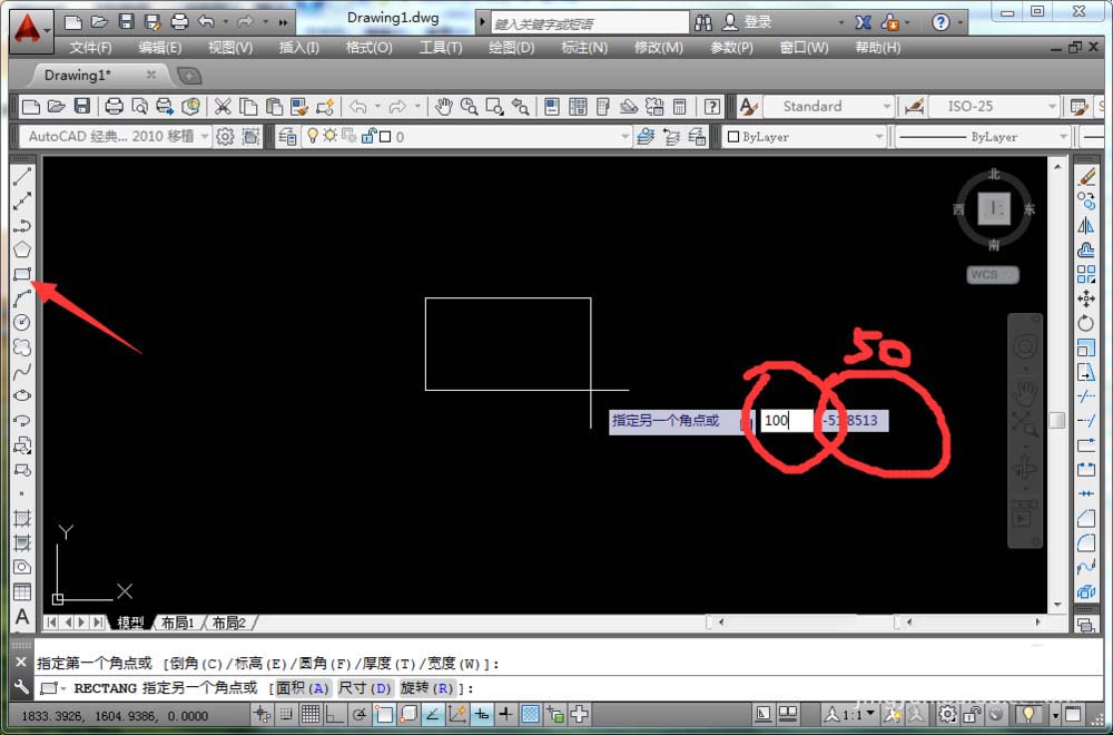 1、先用矩形工具繪制一個長100,寬50的矩形;