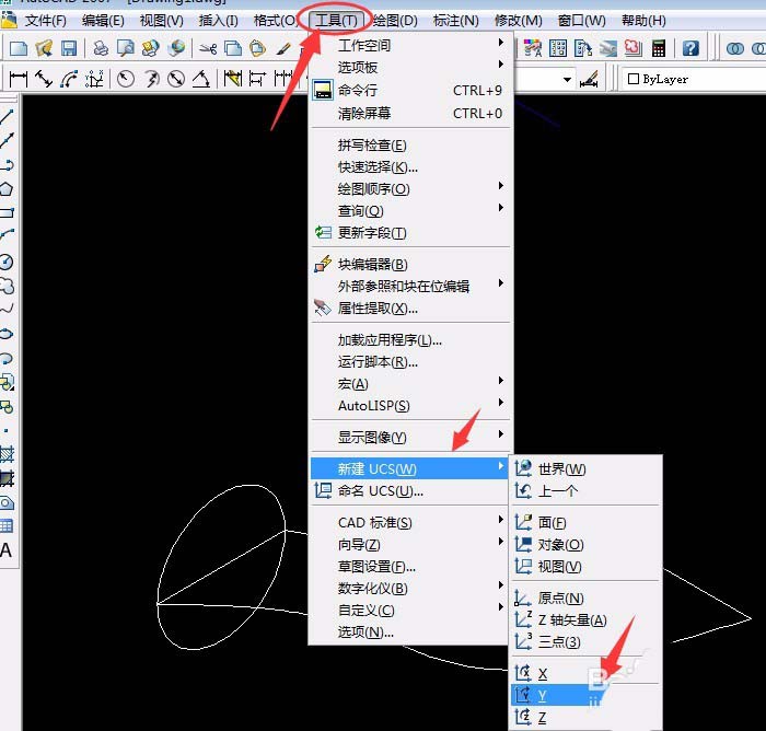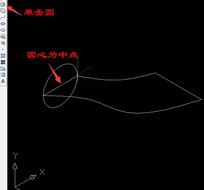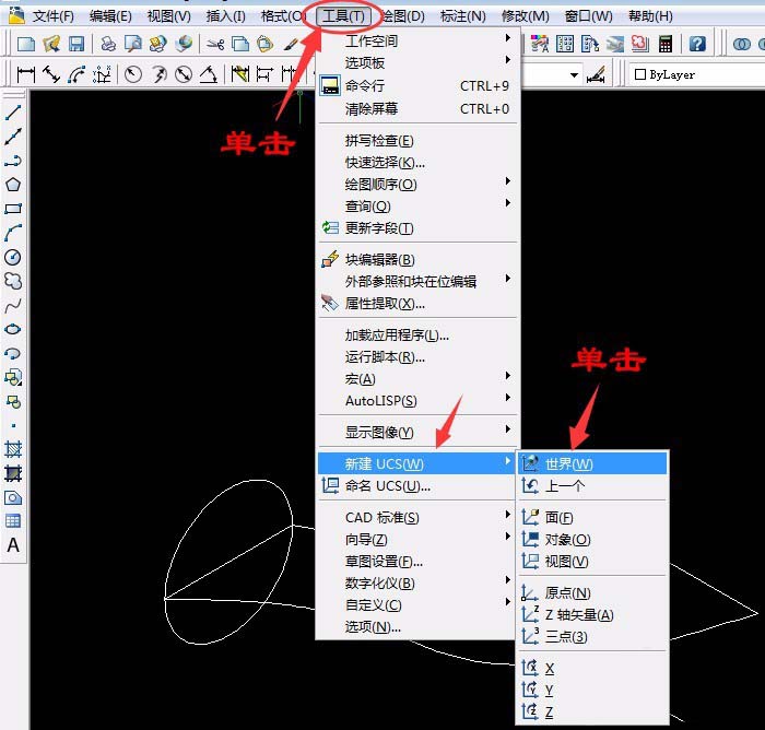 3、單擊“圓工具”以ab線中心為圓心,端點為半徑畫出圓,單擊“工具”菜單中“新建UCS”中單擊“世界”,再單擊“工具”菜單中“新建UCS”中單擊Y軸,已默認Y軸方向旋轉90°按空格鍵確定。