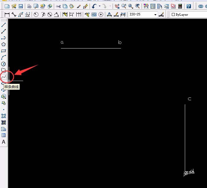 1、用“直線工具”兩條直線,水平ab線垂直cd線(沒有具體尺寸畫大概),再用“樣條曲線 ”畫出bc曲線和ad曲線。
