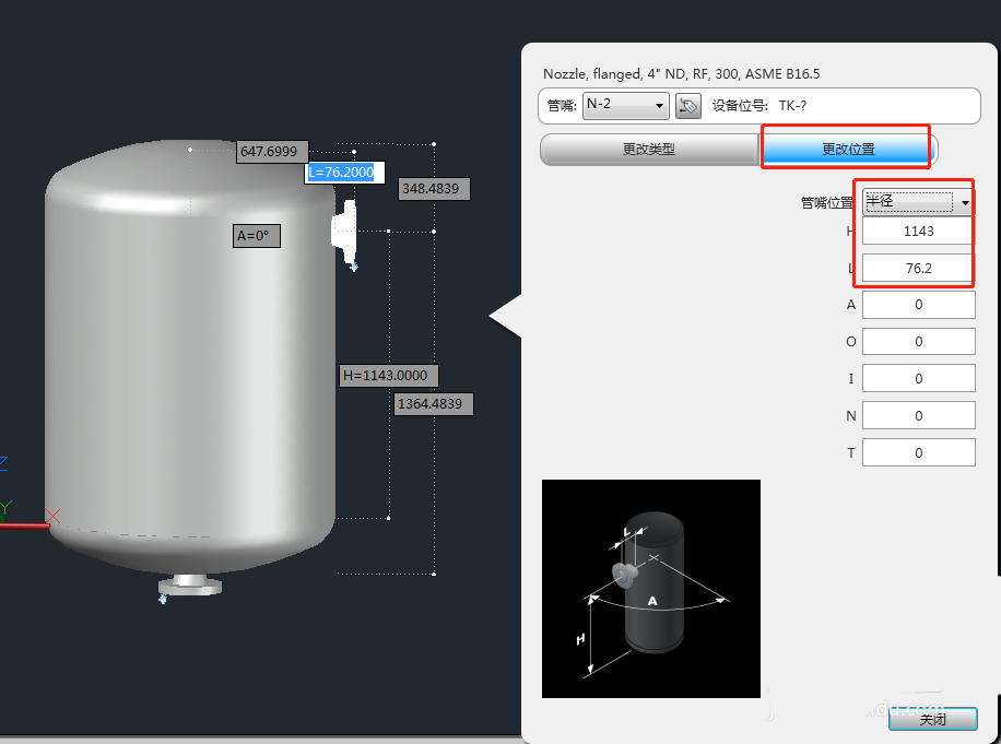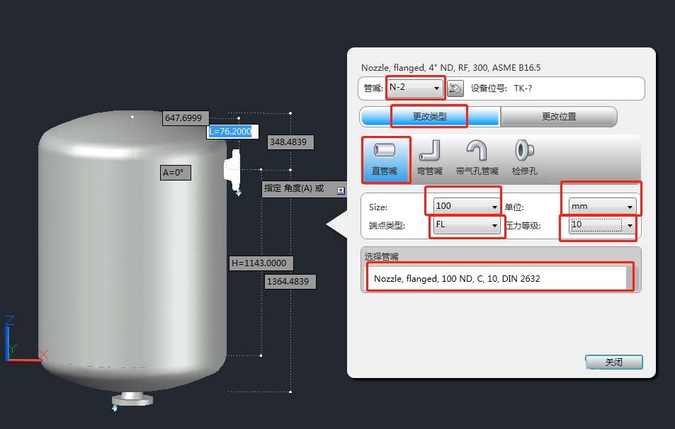 5、之后按CtrL點擊儲罐的管嘴會出現小鉛筆的東西,點一下可以修改管嘴的大小和位置以及伸出長度,這樣一個儲罐的設備模型就建好了。同時你也可以建立臥室儲罐,方法和這個一樣。