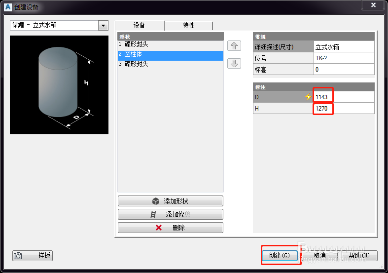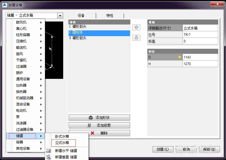 2、依次點常用工具欄>設備>創建,選擇儲罐>立式水箱
