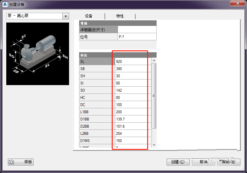 2、之后修改各項參數,泵類的主要定位的是進出口位置,其他的示意放在那里就可以了