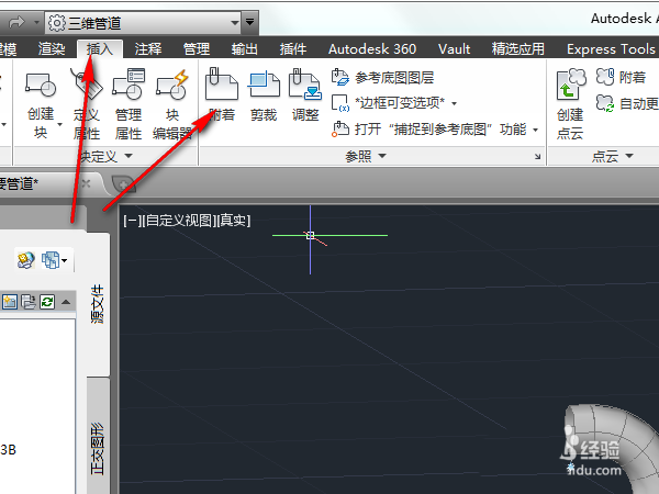 3、畫管道先要定位,需要參照設備的位置。點擊插入——附著。