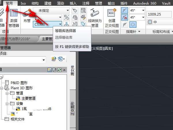 6、接下來就是繪制管道了,點擊常用——選擇管道尺寸——選擇管道壓力等級——點擊布管。