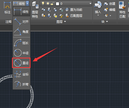 7、點擊線性標注在其下拉列表里找到直徑選項,如圖所示: