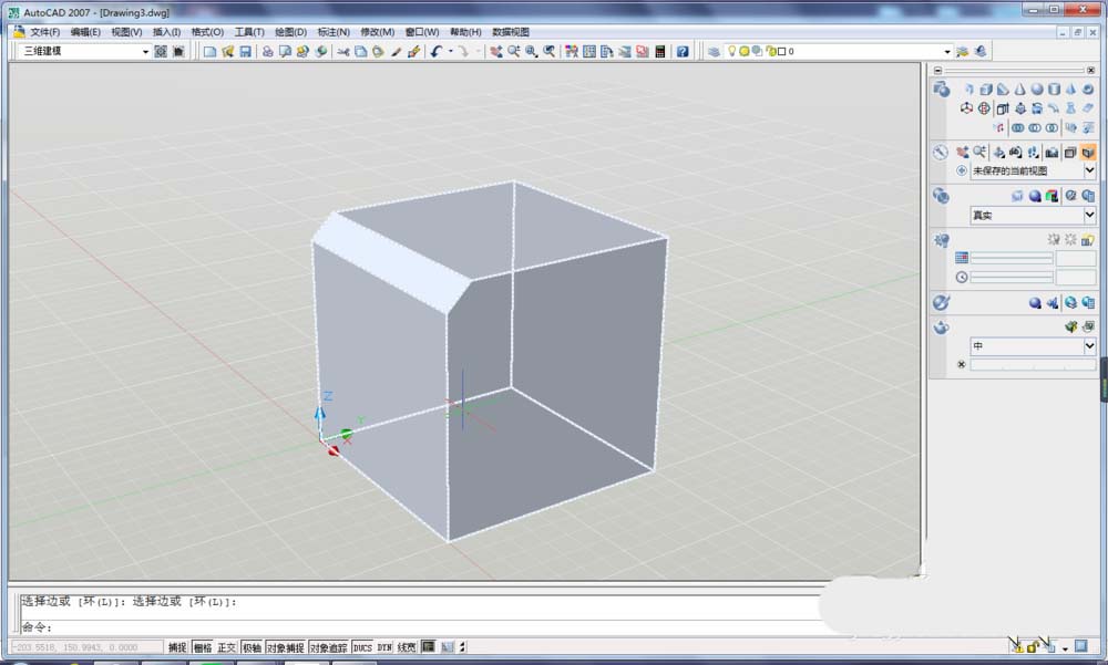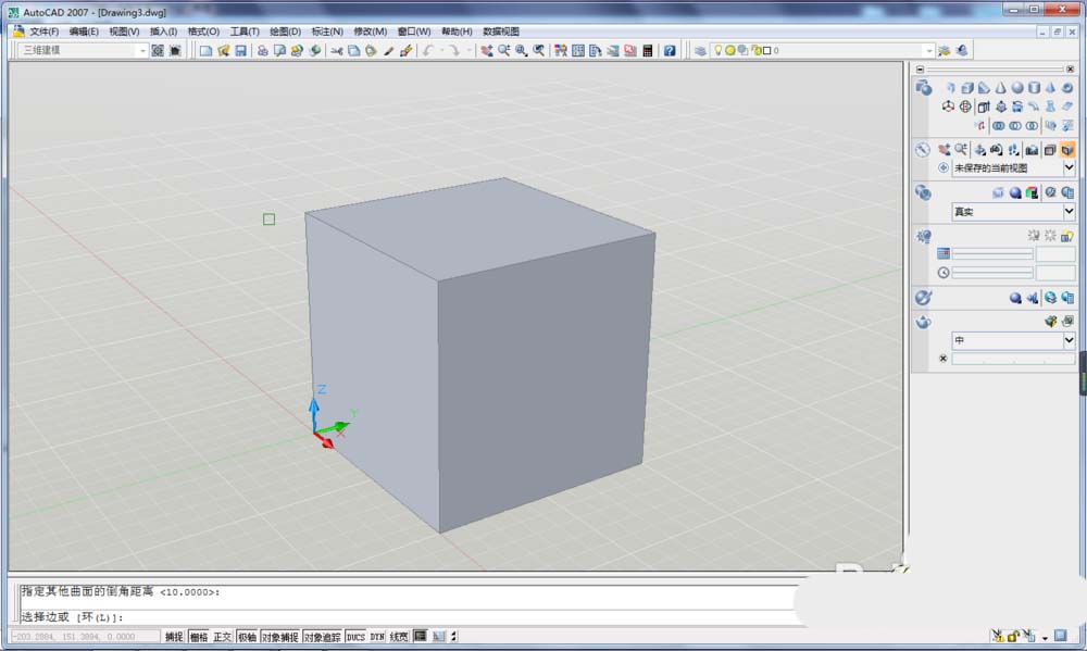 4、激活倒角命令之后,如果是在畫平面二維的畫,直接選擇兩條直線就可以了,但是在三維狀態下,就需要先選擇實體了。見下圖,選擇實體,然后直接回車。