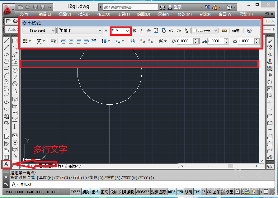 4、點多行文字(A)圖標,在圓中拖一個矩形,接下來會彈出下圖: