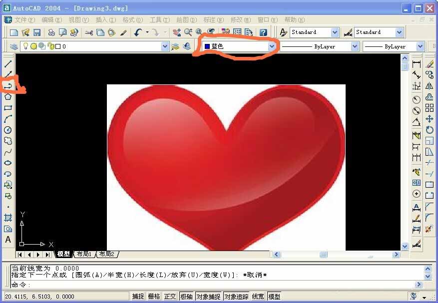5、拖動鼠標放大后,選取一種顏色方便辨認,然后點“多段線”鼠標移到心形圖片的邊任意一點開始描畫