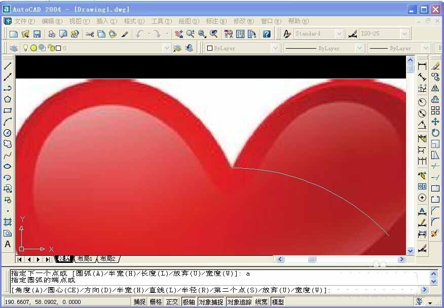 6、在命令行輸入a確認表示用圓弧畫,再輸入S確認,鼠標移到心圖形的第二個點直至畫完