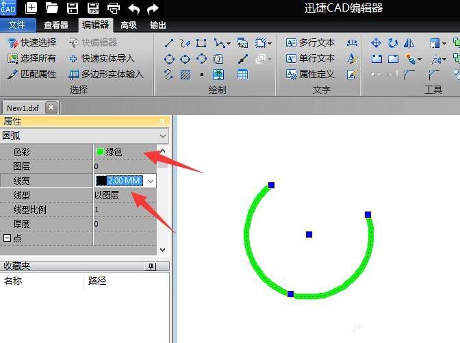 2、首先我們任意選擇一款CAD編輯器,如圖所示,點擊“新建”按鈕即可創建一個新的DXF文檔。如圖所示,切換到“編輯器”選項卡,點擊“工具”欄目中的“弧”工具。