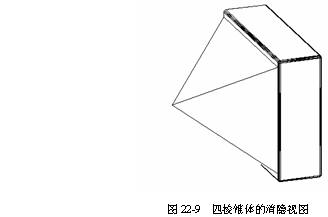 該長方體后側(cè)面中心點與其前側(cè)面的四條邊可分別形成四個平面,使用"slice"命令,以這四個平面為剖分平面,將該長方體剖切為一個四棱錐體,其消隱視圖如圖22-9所示。