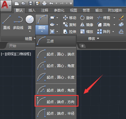 5、在工具區里找到圓弧選項,點擊圓弧選項在其子級菜單里找到起點、端點、方向選項,如圖所示: