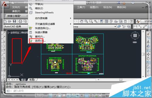 1、打開CAD工程圖紙,或者是打開CAD也行,在空白處單擊鼠標右鍵,彈出快捷對話框,點擊“選項”。