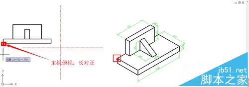 6、然后畫俯視圖。因為主視圖、俯視圖:長對正。所以從主視圖攝取一點畫出底板的俯視圖。