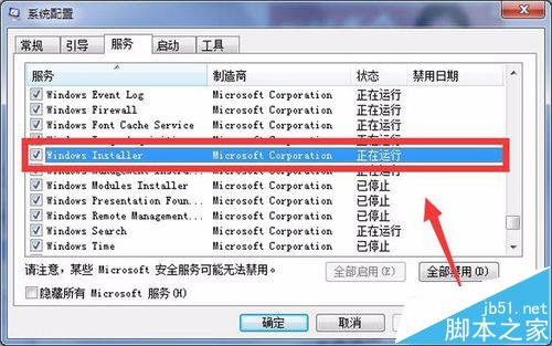 3、最后,在電腦“系統配置”窗口找到“服務”,然后在“服務”窗口下找到“windows installer”設置選項,然后將其“禁用”,如圖