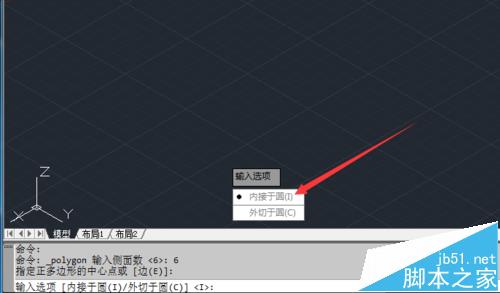 5、接下來會提示指定正多邊形中心點,單擊某處就可以了。然后是輸入選項,選擇內接于圓就可以了。