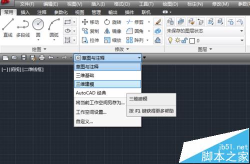 1、畫立體圖形的初始設置。找一找帶齒輪圖標的下拉三角,單擊它,選擇三維建模。這是工作空間設置。