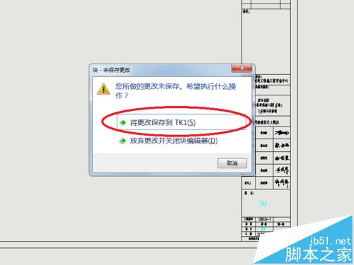 6、彈出“塊-未保存更改”,想要保存圖框中你已修改的內容,就要點擊“將更改保存到TK1(S)”,這樣你圖框的內容就修改完畢了。