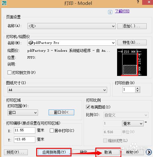 2、對每個需要打印的文件均執行以下操作:點擊 文件,打印,然后設置打印機,打印區域之后,點擊 應用到布局,然后點擊 取消 :