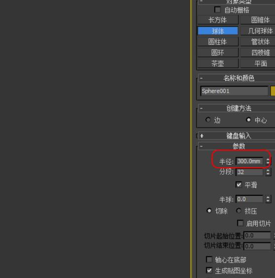 4、球體繪制完畢,在右側(cè)參數(shù)中修改繪制的球體參數(shù)。