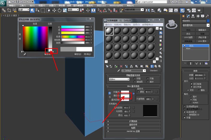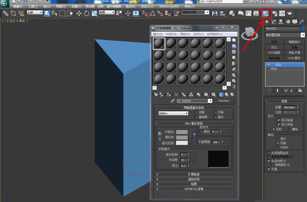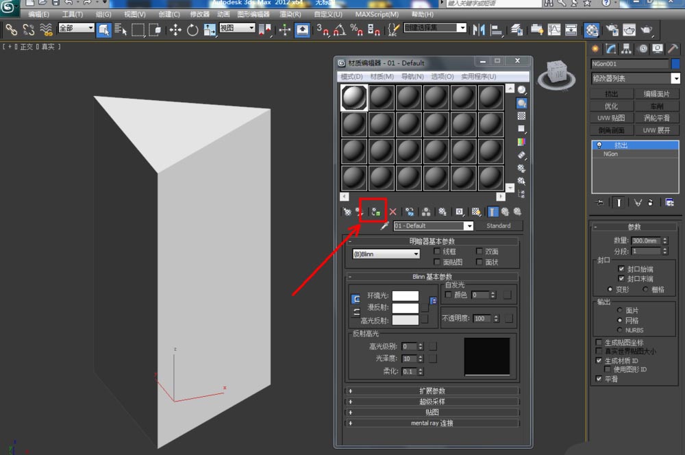 4、點擊【材質編輯器】,按圖示設置一個白色材質球并附加給模型即可。這樣我們的三棱柱就制作完成了,趕緊試試吧!