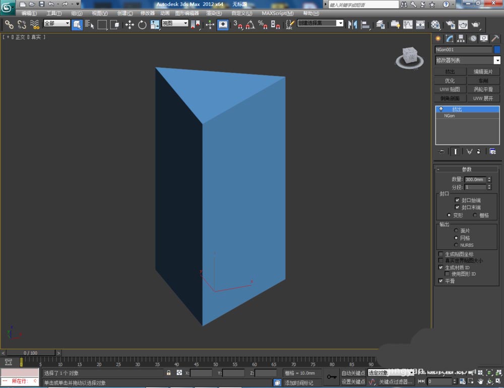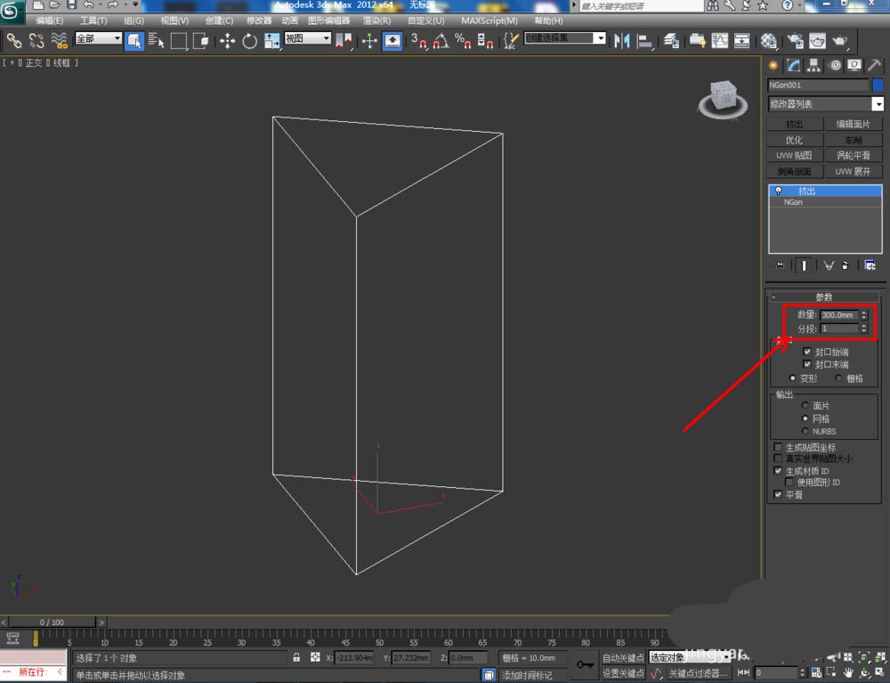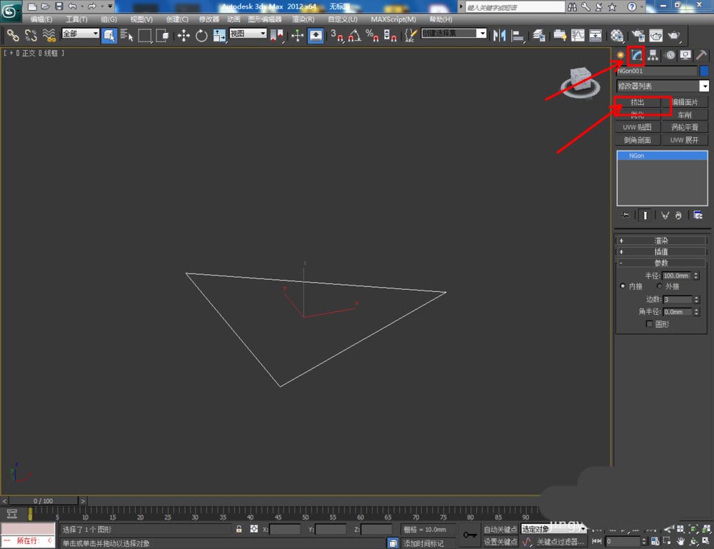3、選中三邊形,點擊【修改】-【擠出】,按圖示設置好擠出的各個參數,繪制出一個三棱柱模型;