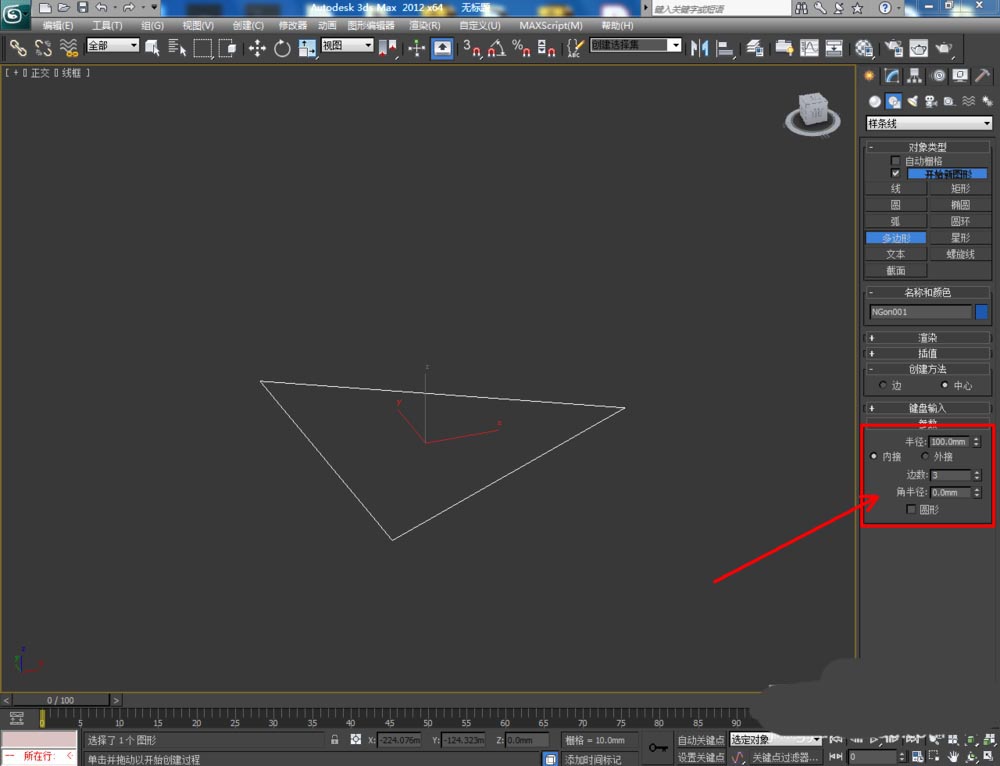 2、點擊【創建】-【圖形】-【多邊形】,按圖示對多邊形參數進行設置,繪制出一個三邊形圖案;