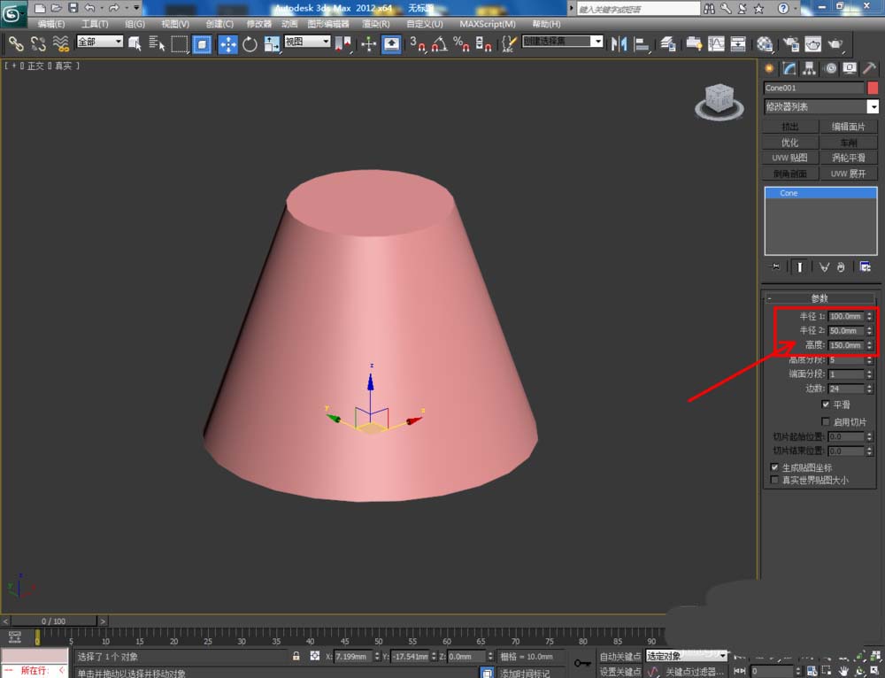 2、選中圓臺模型,點擊【修改】對圓臺各個參數進行設置;