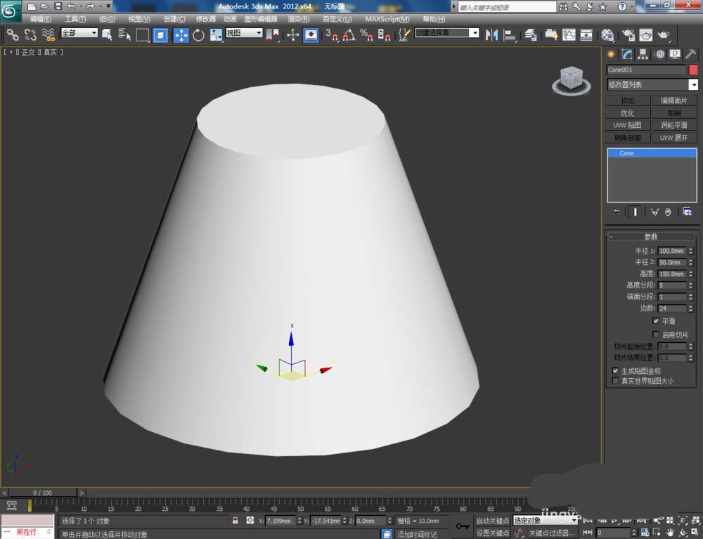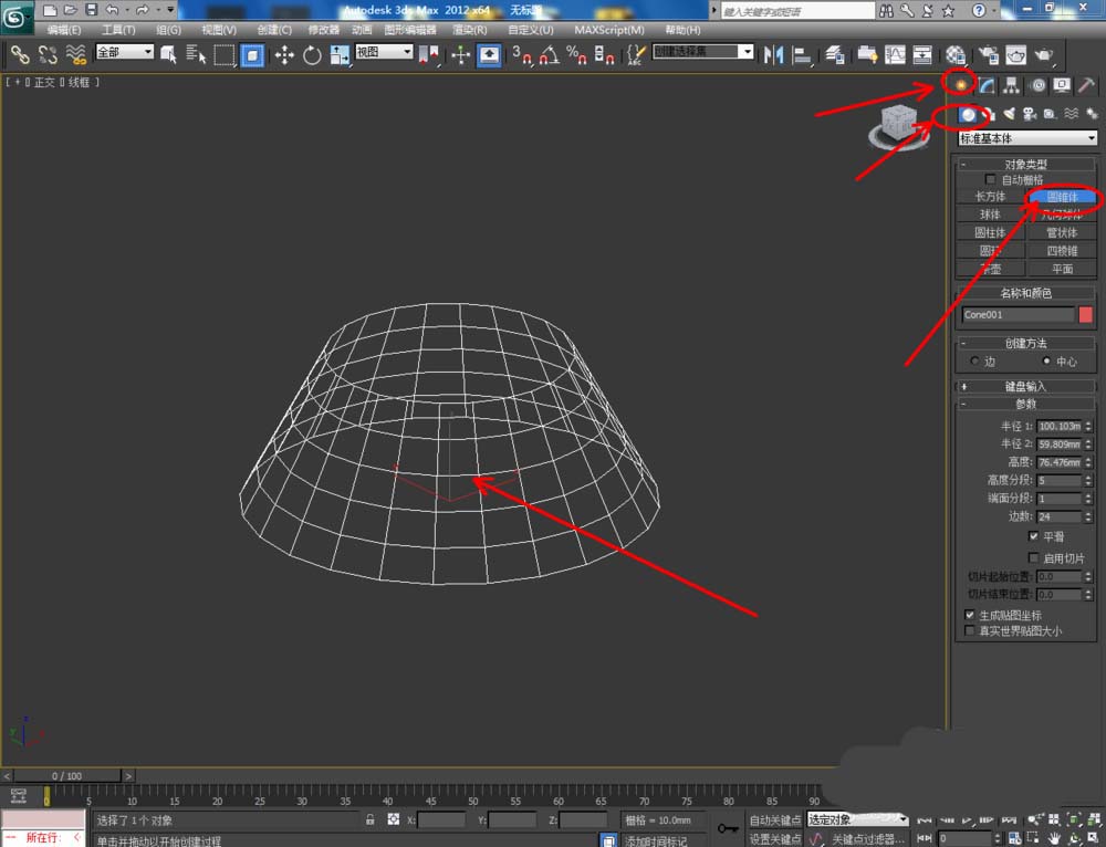 1、打開3Dmax2012軟件,點擊【創建】-【幾何體】-【圓錐】,繪制一個圓臺模型;