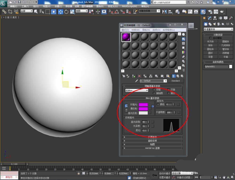 2、點擊【材質編輯器】彈出材質編輯器設置欄,按圖示設置一個洋紅色光面材質球并將材質球附加給球體模型,這樣我們通過軟件自帶球體工具制作的球體模型就完成了;