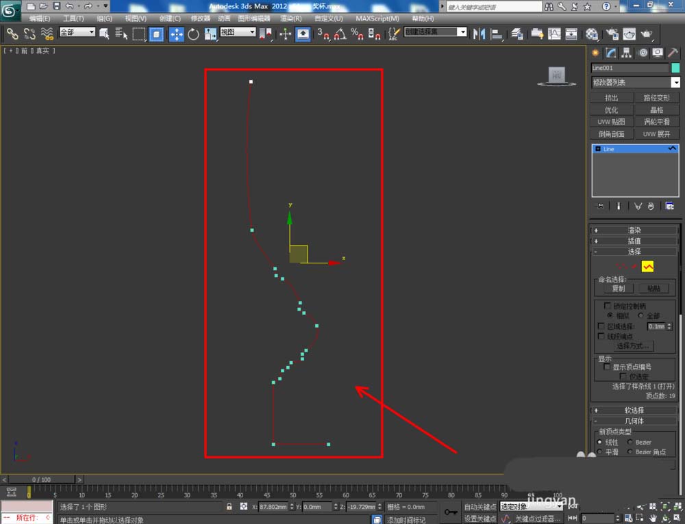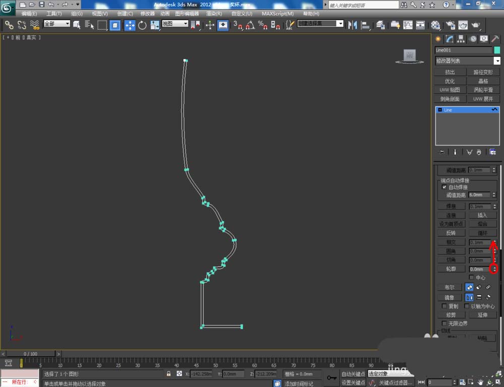 3、點擊右邊工作區中的樣條線,選中整個線條圖案上的樣條線后,鼠標向上拉動【輪廓】右邊的小三角,對線條圖案進行輪廓處理,完成獎杯截面圖案的制作(如圖所示);