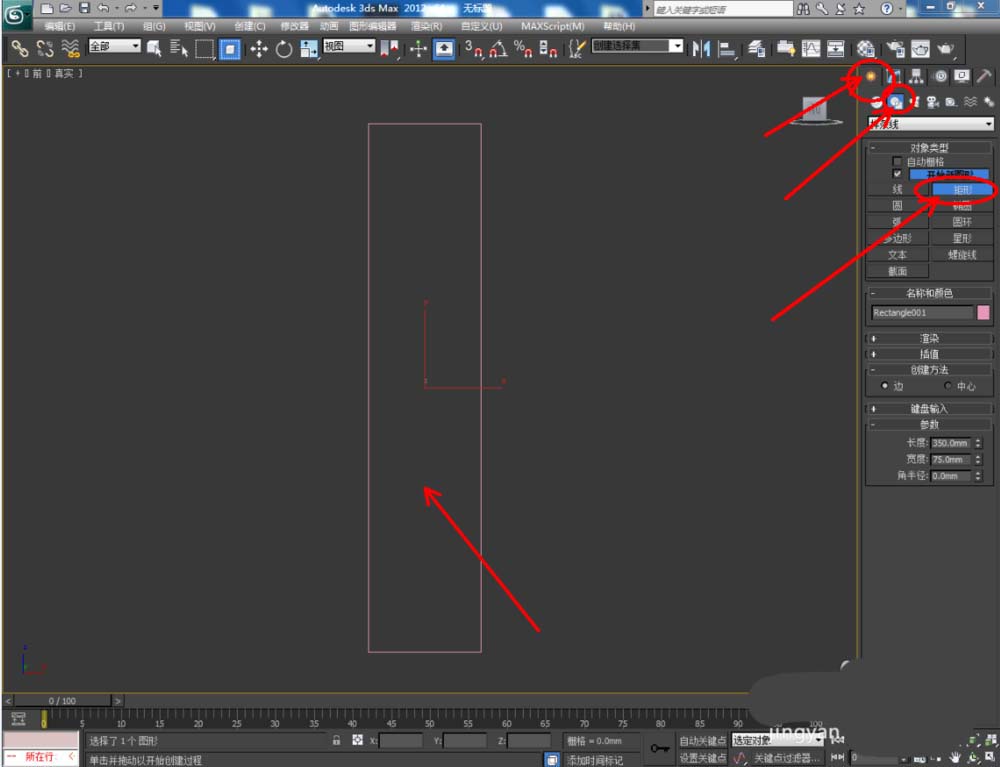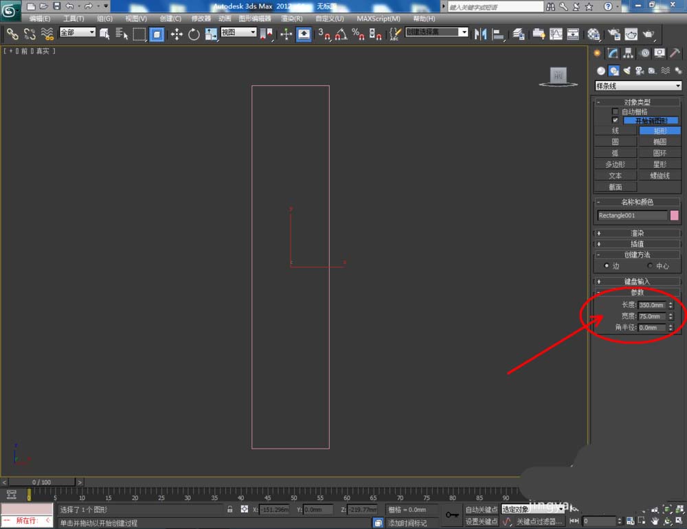 1、打開3Dmax2012軟件,點擊【創建】-【圖形】-【矩形】,在作圖區域繪制一個參考矩形圖案并按圖示設置好矩形圖案的各個參數;